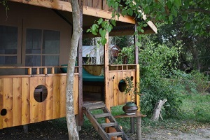 A green ceiling of tree branches and leaves, providing almost always shade throughout the day, covers the camp